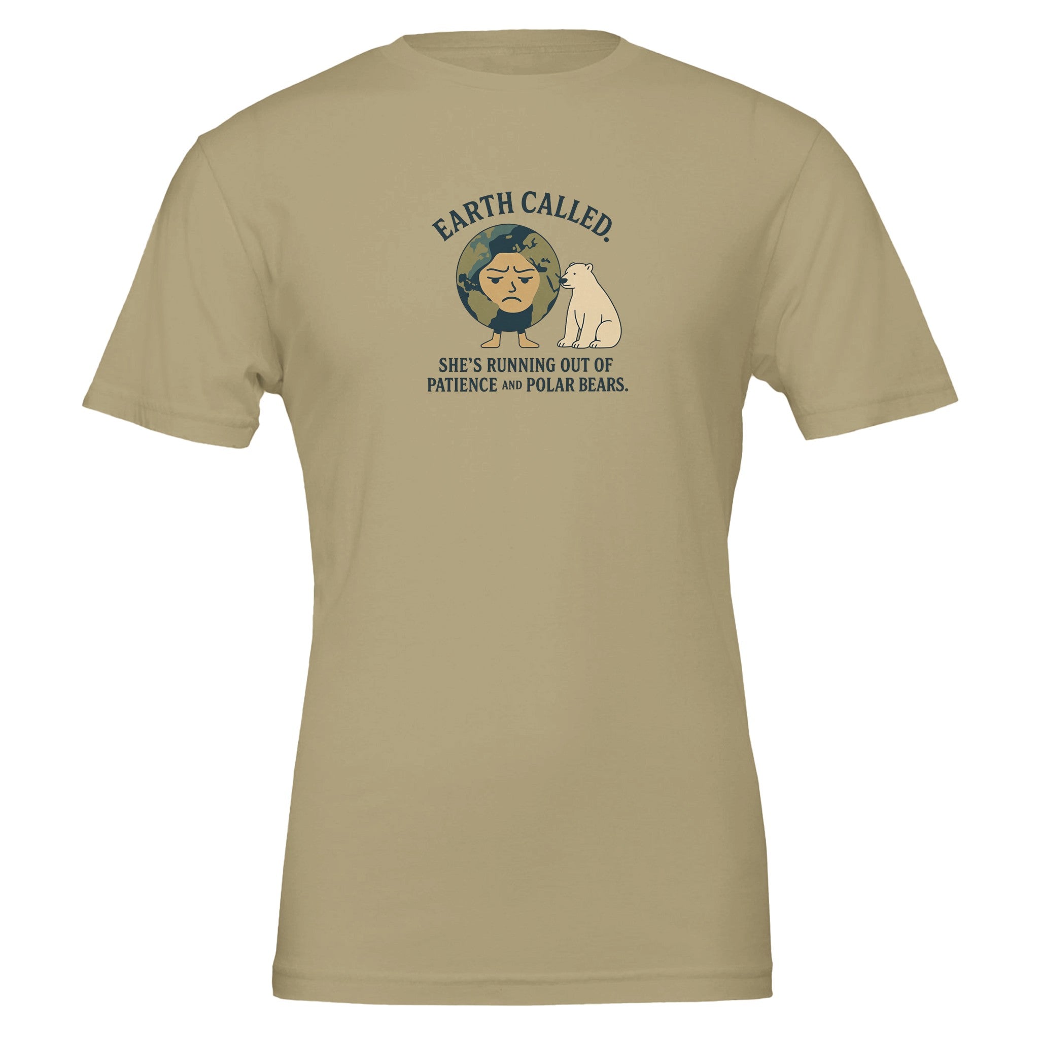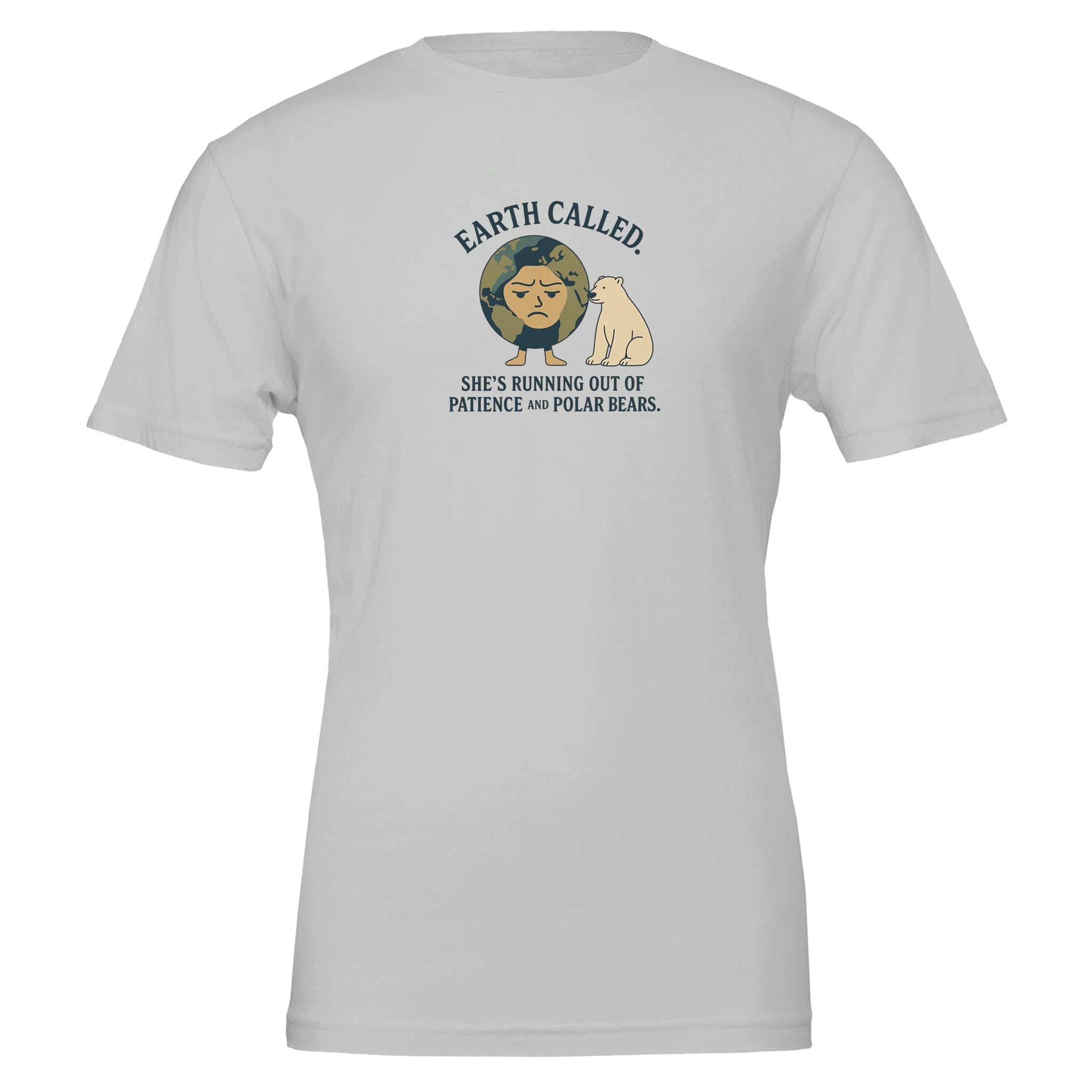 Show your sense of humor and environmental awareness with our premium eco-friendly t-shirt featuring a comical graphic that reads, 'Earth Called. She's Running Out of Patience and Polar Bears.' This t-shirt is not only a conversation starter but also a commitment to sustainable fashion.