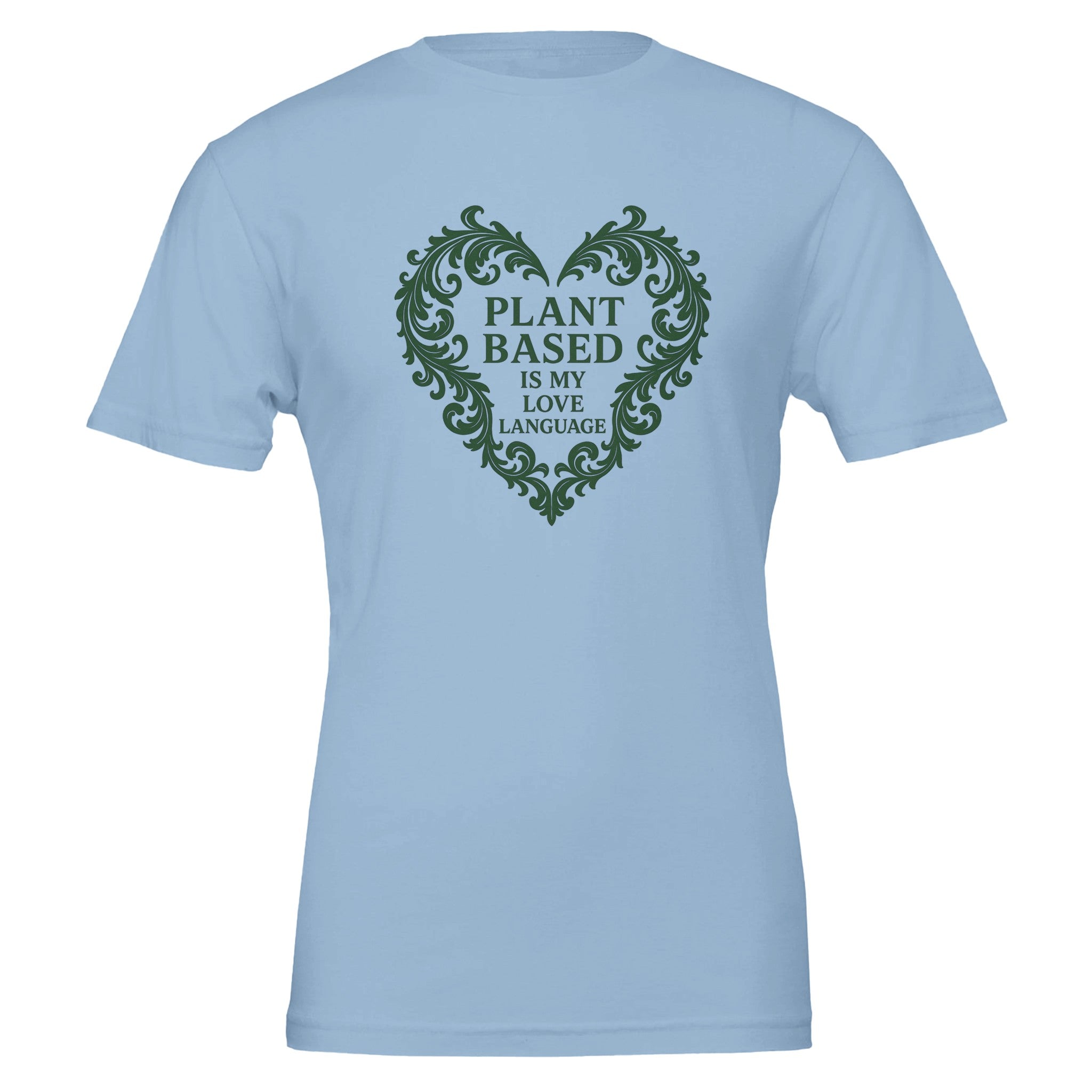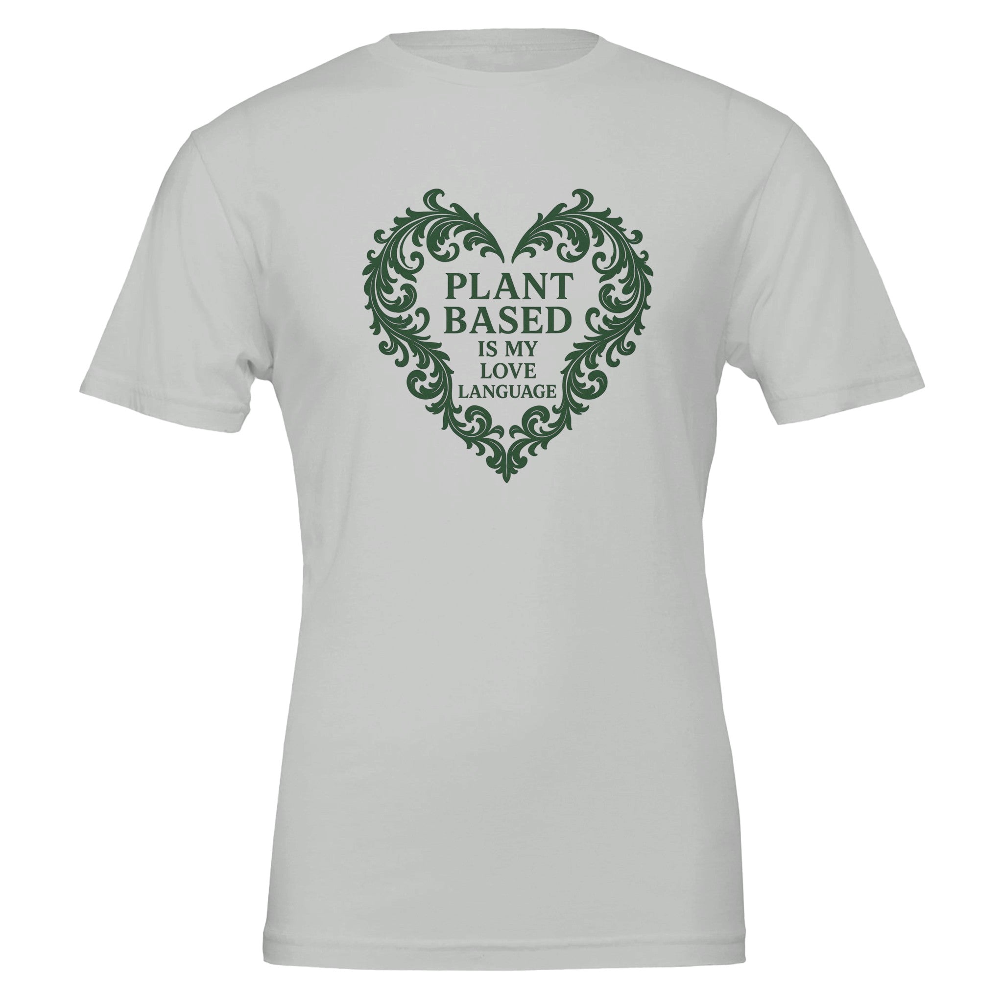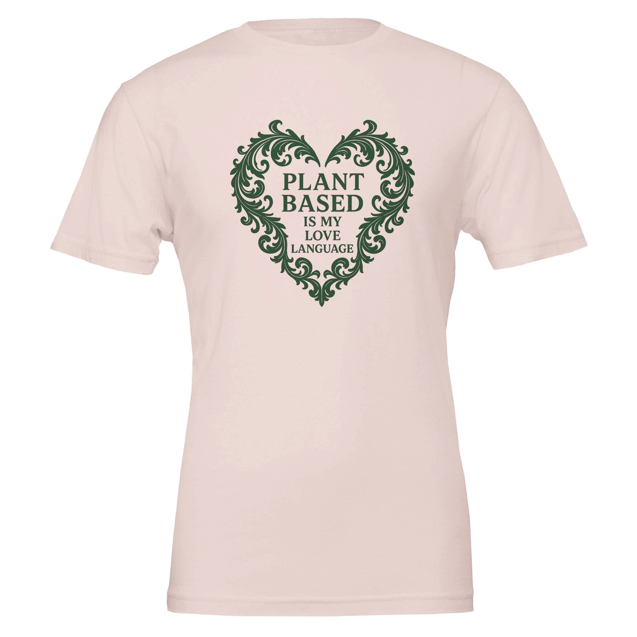 This funny vegan tshirt that reads 'Plant based is my love language' will resonate with vegans, vegetarians, and sustainable fashionistas alike. Show off your sense of humor and your eco friendly pride in this 100% Airlume combed and ring-spun cotton. Designed on Bella + Canvas 3001 with perfect tailoring in the side-seam for an unisex fit to enhance the body contour. Ultra-soft comfort pairs with durable strength.