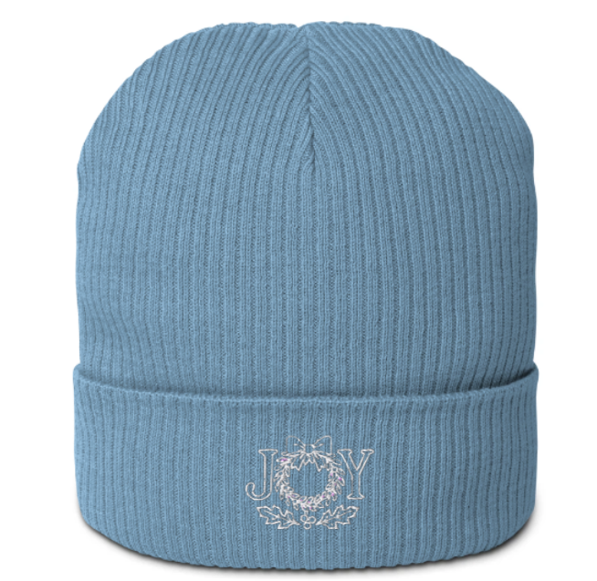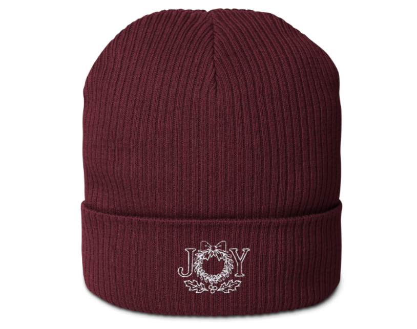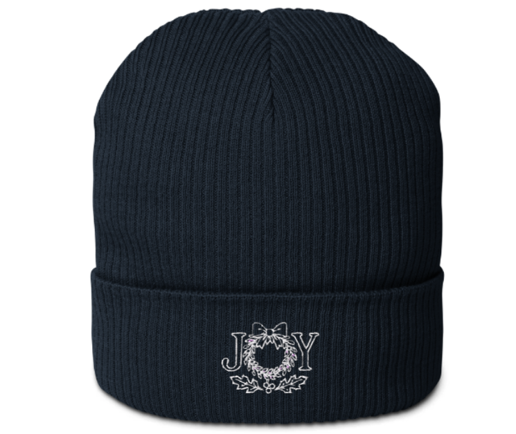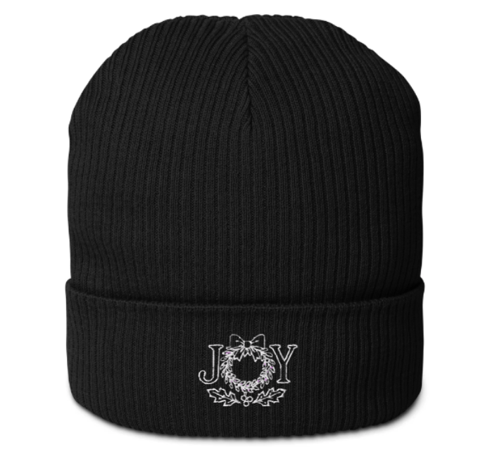 This 100% organic cotton ribbed beanie is sure to bring you joy this holiday season. Embroidered in an elevated stitch technique, the word "Joy" along with a festive wreath and holly will get you in the holiday mood in no time! Wam, stylish, and eco-friendly. What more could you want during the season?