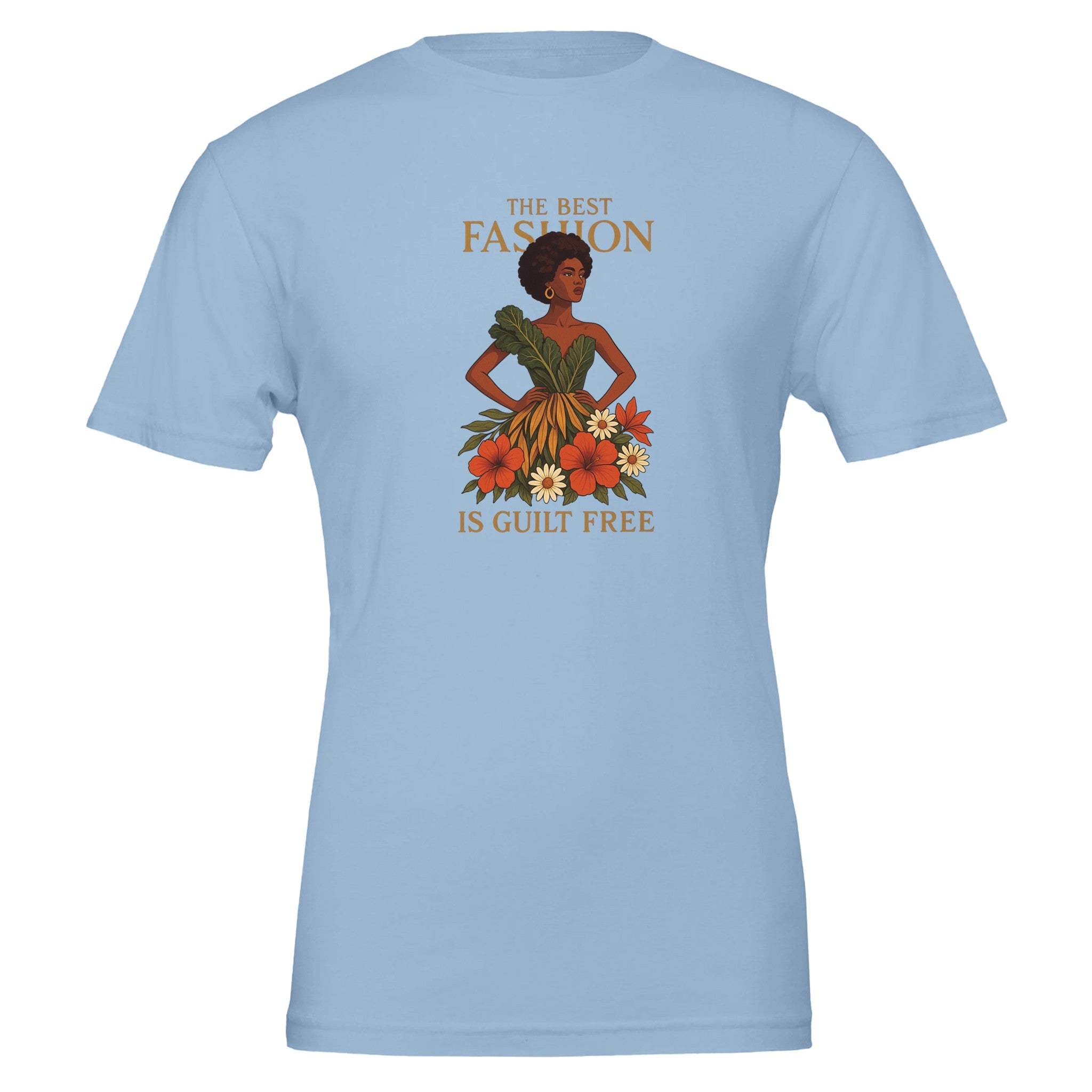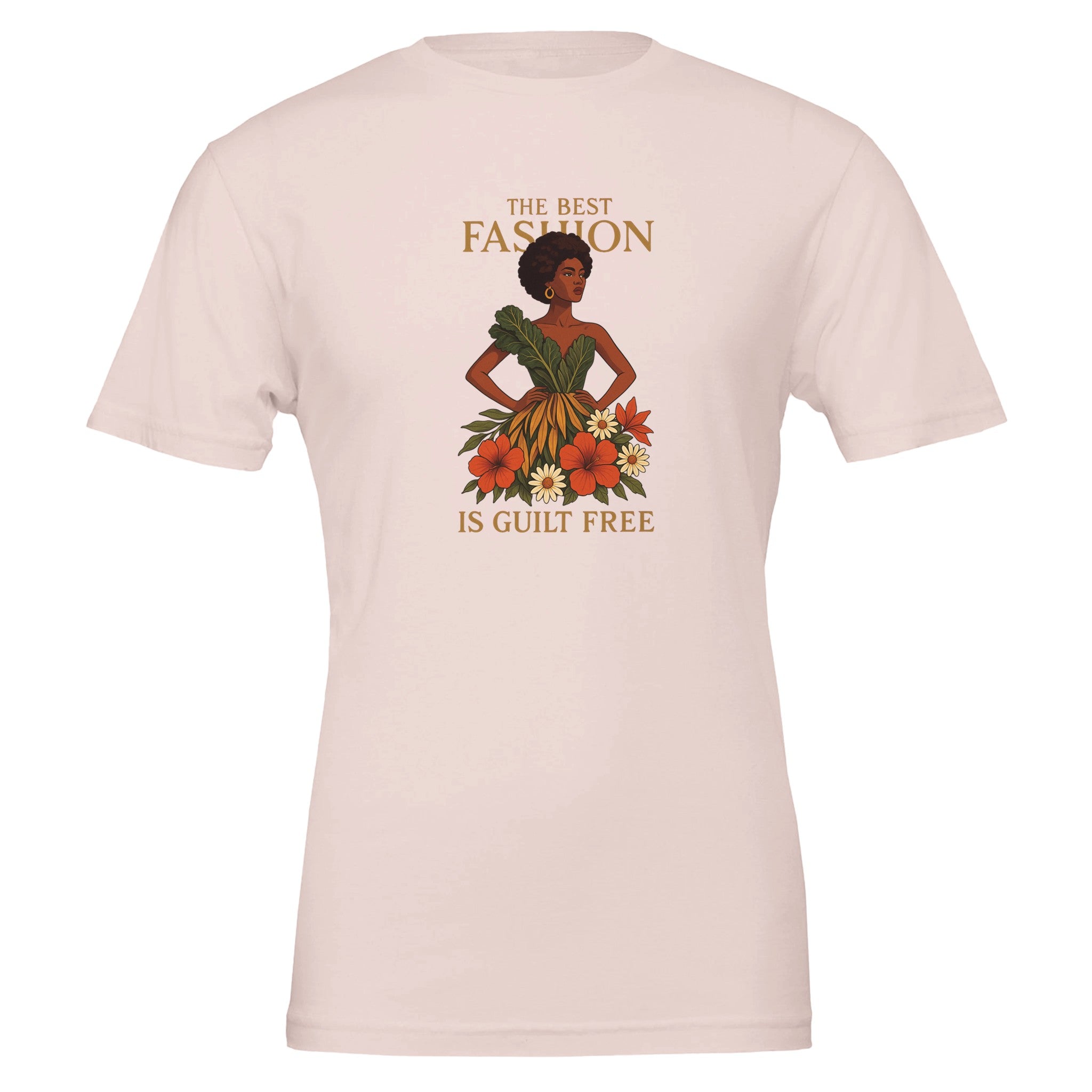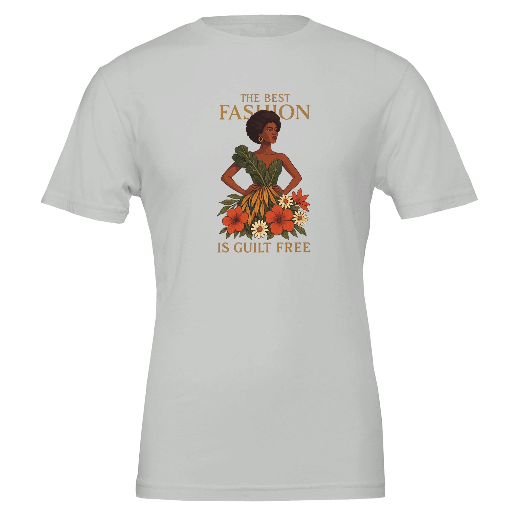Eco friendly t-shirt made from 100% Airlume combed and ring-spun cotton. Features a stunning graphic of a model in a sustainable dress adorned with floral and fauna accents. "The best fashion is guilt-free" embodies your eco-conscious and savvy mindset. Designed from Bella + Canvas 3001 for ultra-soft feel and all-day comfort while being strong enough to endure wear. Perfectly tailored with a side-seam for an unisex fit, it enhances the body contour.