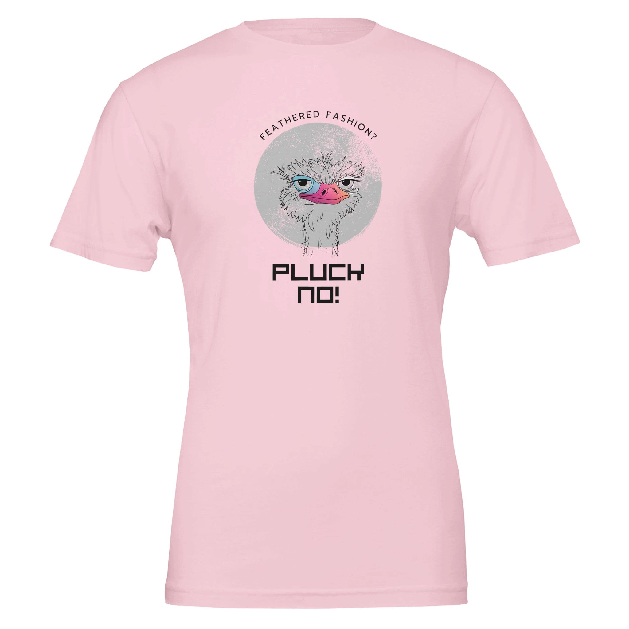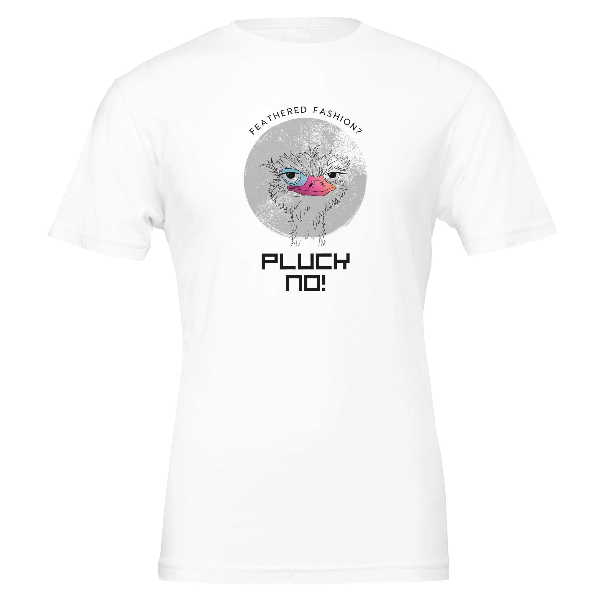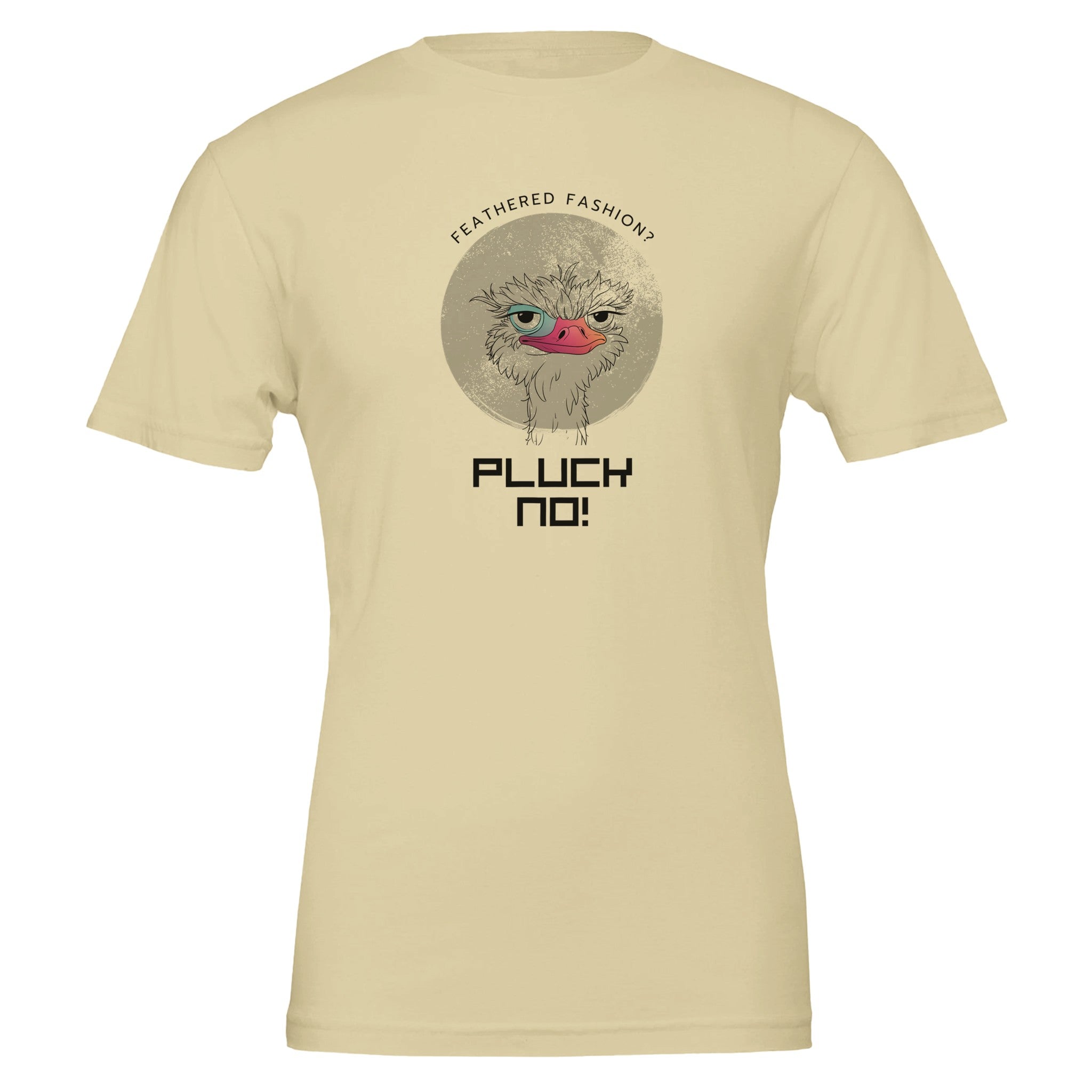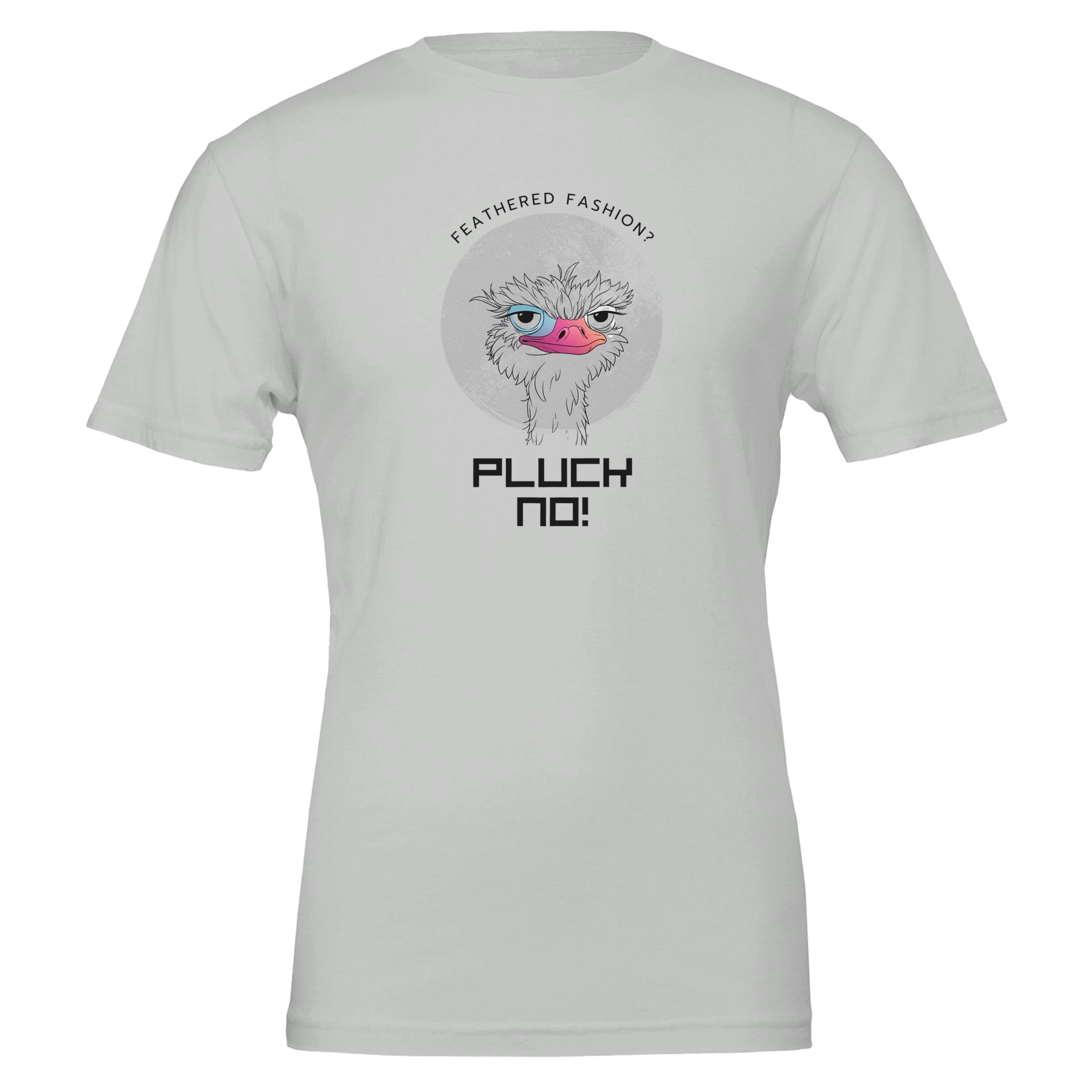 Funny vegan fashion Tshirt featuring an ostrich saying, "Feathered Fashion? Pluck No!" Hilarious and impactful. Wear your values on your chest. This super soft Bella + Canvas 3001 premium t-shirt is also vegan friendly; made from 100% Airlume combed and ring-spun cotton.