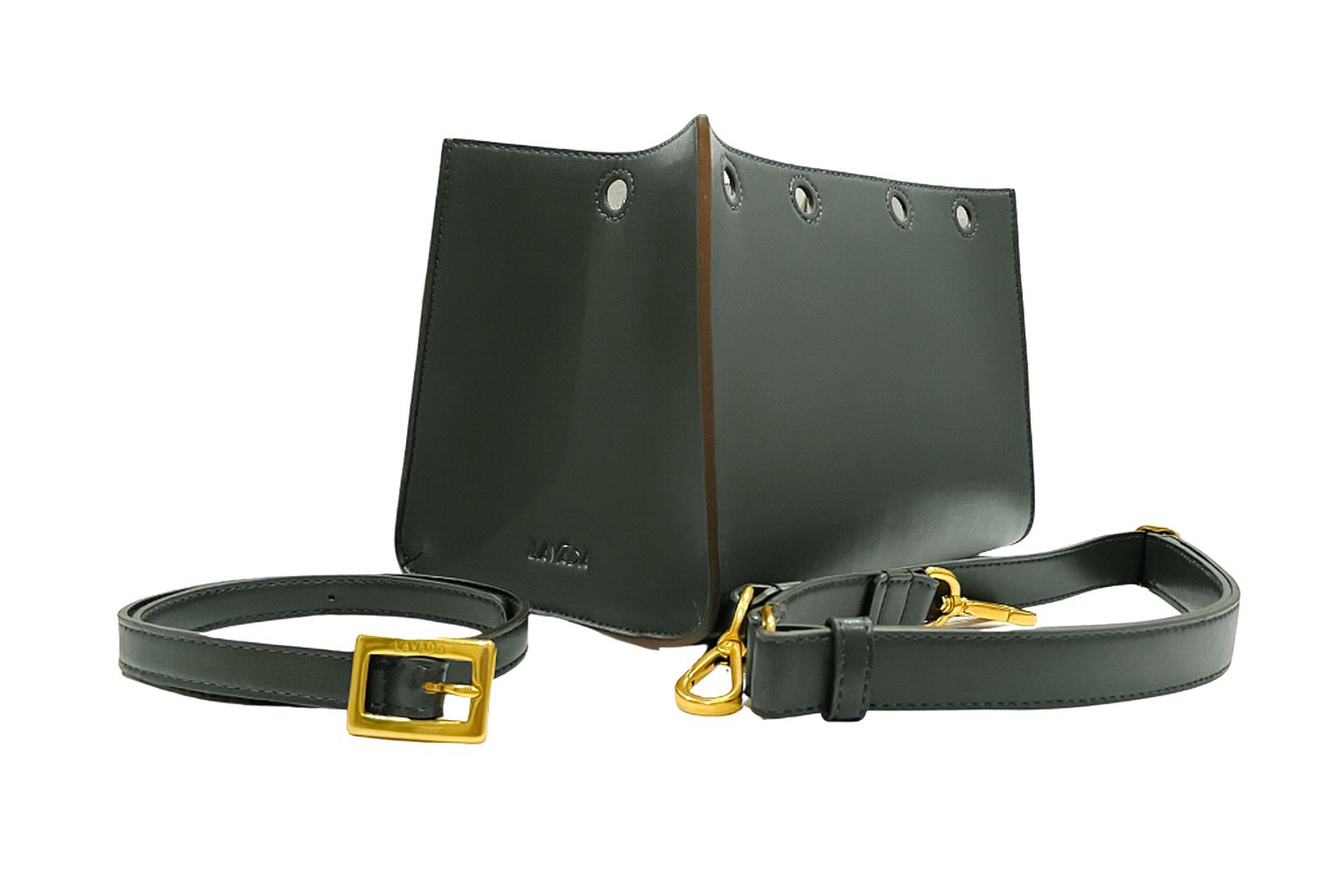 A luxe hybrid of emerald and olive green, this gorgeous desert green set of interchangeable accessories will light up either your black or tan Lavāda base bag. The bundle includes the outer cover, belt, and carrying strap. (Other accessories, like scarfs, sold separately.) No animal products, just sumptuous cactus vegan leather that has an unbelievable feel. Adorned with natural brass hardware. No plastics, nylon or PU.