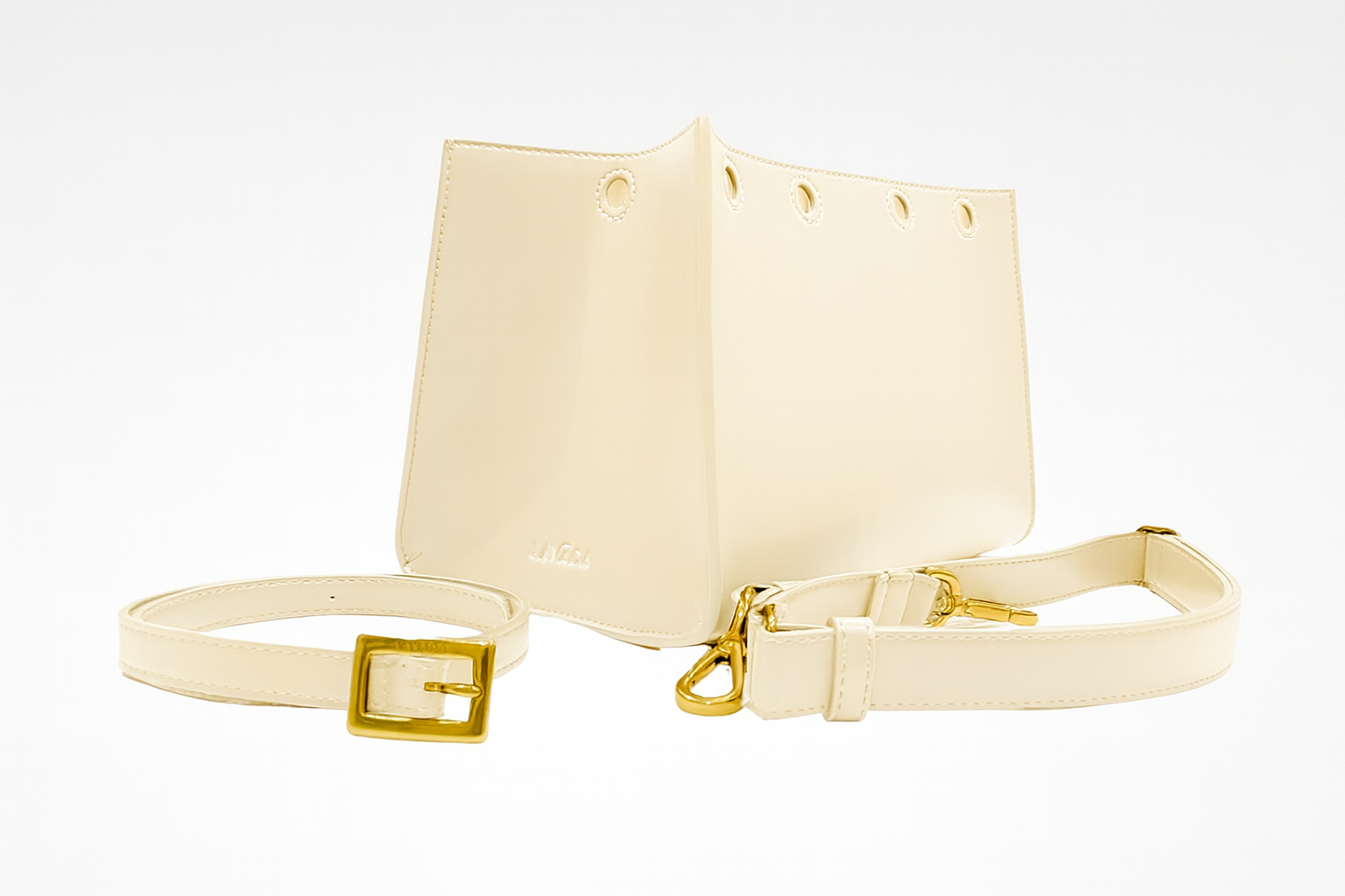 Neutral and classy, the off white set of interchangeable accessories will compliment either your black or tan Lavāda base bag. The bundle includes the outer cover, belt, and carrying strap. (Other accessories, like scarfs, sold separately.) Made with soft and durable cactus vegan leather that has fooled even the most discerning leather lovers. Accented with natural brass hardware. This is truly environmentally friendly and bio degradable material; not plastic, nylon or PU.