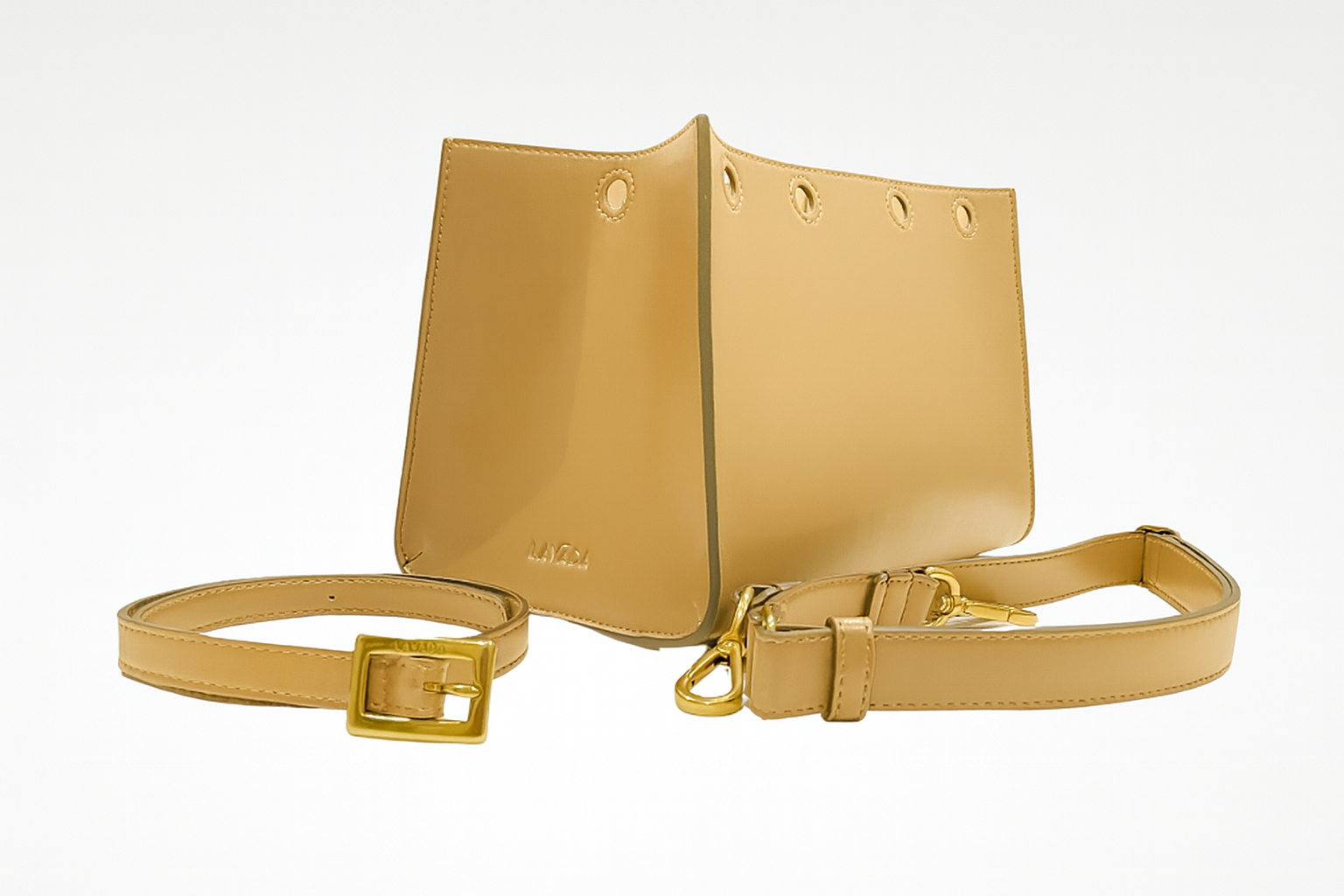 Like the desert sands, this rich tan set of interchangeable accessories will look amazing against the Lavāda black base handbag.The bundle includes the outer cover, belt, and carrying strap. (Other accessories, like scarfs, sold separately.) Just like the main bag, these pieces are made from cruelty-free, cactus vegan leather. And they are adorned with natural brass hardware. No plastics, nylon or PU.
